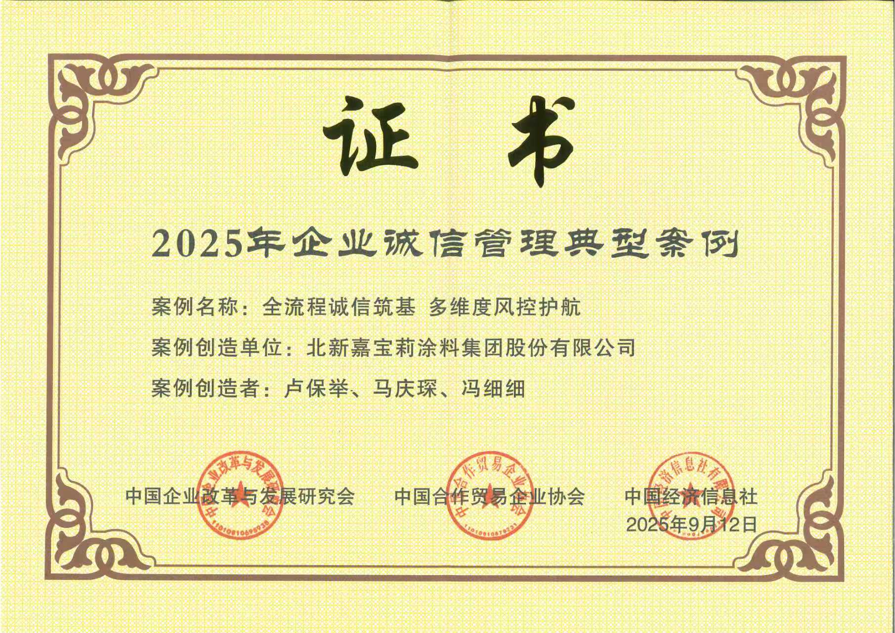 中材节能作为节能环保领域的领军企业,,,,,,,将诚信理念深植于企业运营全流程,,,,,,,通过构建完善的制度系统、深化员工诚信教育、优化客户效劳与强化社会监视,,,,,,,一连提升企业信用价值。。。。。。北新嘉宝莉聚焦涂料工业特点,,,,,,,立异性地将诚信建设与危害控制深度融合,,,,,,,从供应链治理、生产质控到客户效劳各环节筑牢诚信基本,,,,,,,以多维度风控系统为企业稳健生长护航。。。。。。山东瑞泰始终秉持诚信感恩的焦点理念,,,,,,,依附专业手艺团队、完善的文化治理系统和优质的手艺效劳,,,,,,,在行业内树立了优异口碑。。。。。。三家企业的案例乐成入选,,,,,,,不但是其各自诚信治理实践获得的高度认可,,,,,,,更是j9游国际站官网集团整体信用系统建设效果的微观体现和生动实践。。。。。。
