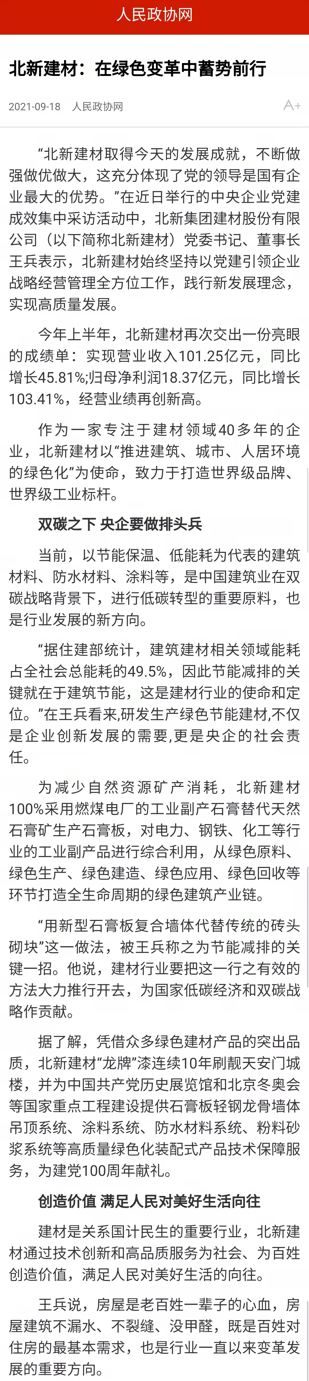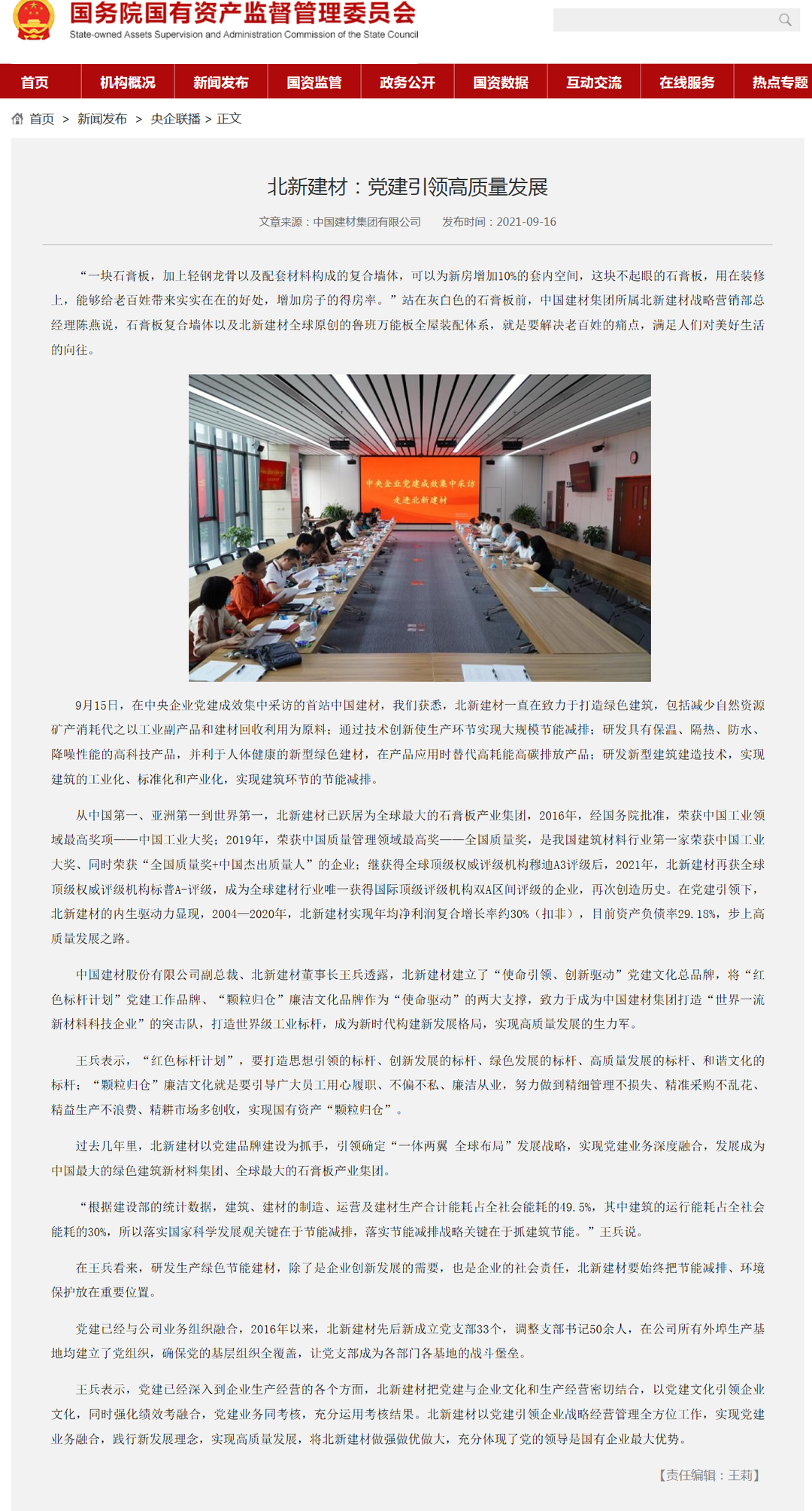 泉源:国资委官方网站、灼烁日报、工人日报、人民政协网、中国证券报、逐日经济新闻、北新j9游国际站官网 宣布时间:2021-10-09在天下国有企业党的建设事情聚会召开五周年之际,,,,,,,国资委新闻中心团结人民网等平台组织的“对话新国企·党建各人谈”系列融媒体访谈上线,,,,,,,访谈中多位中央企业党建事情认真人共话国企党建新时势,,,,,,,j9游国际站官网集团党委书记、董事长周育先受邀加入访谈,,,,,,,讲述党建引领化解重组难题、立异打法走上生长快车道。。。。。。。。同时,,,,,,,集团所属北新j9游国际站官网作为“中央企业党建效果媒体集中采访”运动首站已完成访谈报道,,,,,,,充辩白明j9游国际站官网集团走在高质量党建引领高质量生长的前端。。。。。。。。