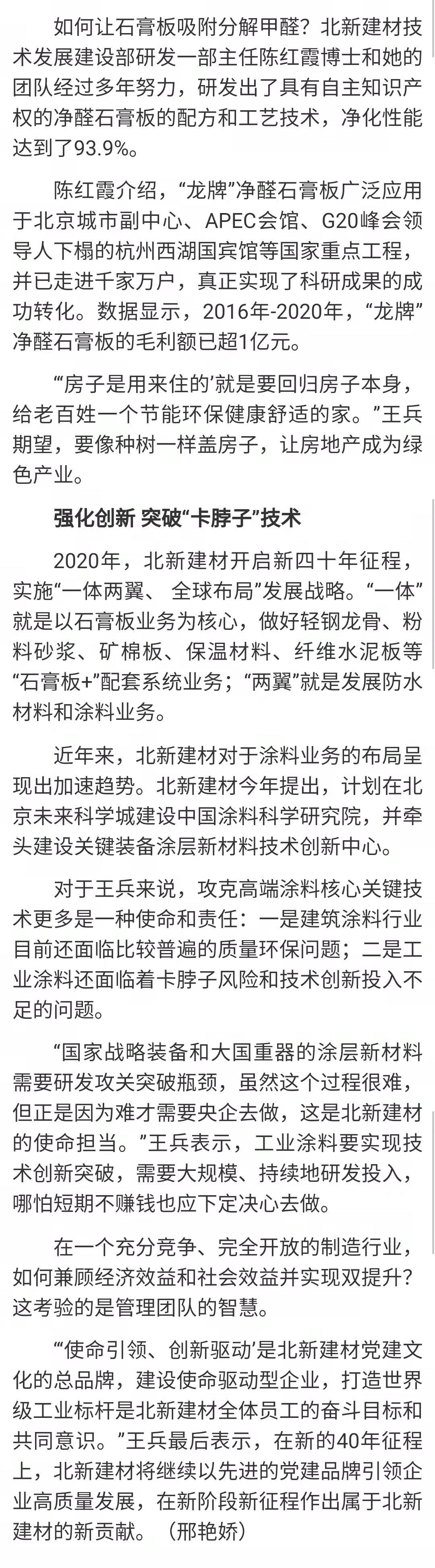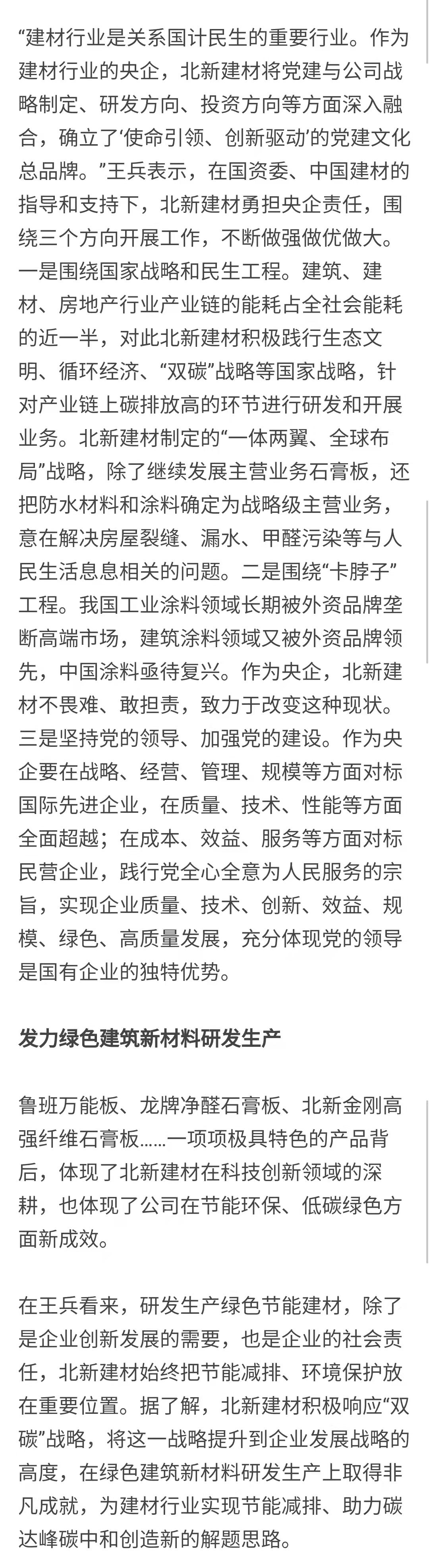 一是围绕国家战略和民生工程。。。。。。。。修建、j9游国际站官网、房地产行业工业链的能耗占全社会能耗的近一半,,,,,,,对此北新j9游国际站官网遵照j9游国际站官网集团“善用资源 效劳建设”理念,,,,,,,起劲践行生态文明、循环经济、“双碳”战略等国家战略,,,,,,,针对工业链上碳排放高的环节举行研发和开展营业。。。。。。。。围绕人民对优美生涯的神往,,,,,,,北新j9游国际站官网实验“一体两翼、全球结构”生长战略,,,,,,,除了牢靠主营营业石膏板,,,,,,,还生长防水质料和涂料两个营业领域,,,,,,,为与人民生涯息息相关的衡宇裂痕、漏水、甲醛污染等问题提供解决计划。。。。。。。。