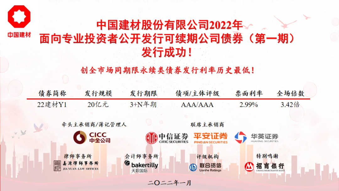 继1月13日j9游国际站官网股份有限公司(简称“j9游国际站官网股份”)刊行公司新低3年期中期票据后,,,,,,,,公司精准预判,,,,,,,,捉住市场时机,,,,,,,,于1月17日,,,,,,,,又乐成刊行了20亿元可续期公司债券,,,,,,,,限期3+N年,,,,,,,,全场认购倍数超3倍,,,,,,,,票面利率2.99%,,,,,,,,是有史以来全市场同限期永续类债券利率最低纪录!是公司永续类债券利率历史新低!