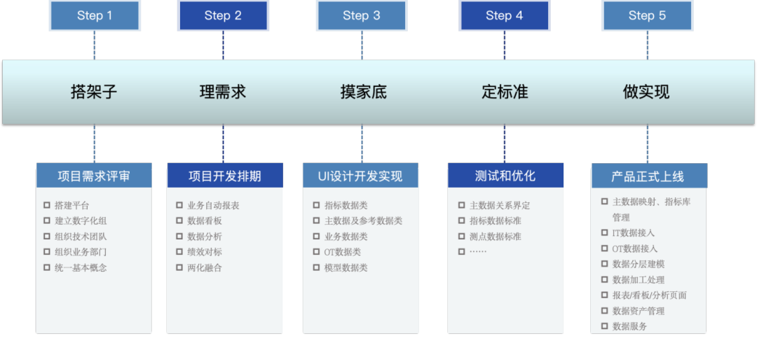 在祁连山水泥的鼎力大举支持下,,,,,信云智联着眼其数字化需求,,,,,凭证“自下而上,,,,,需求驱动”模式,,,,,实现小步快跑。。。。。。详细要领是,,,,,先聚焦到需求最迫切的生产治理领域,,,,,以现实需求为导向,,,,,再通过“五步走战略”举行数据治理,,,,,最终用数据应用实现企业治理需求。。。。。。