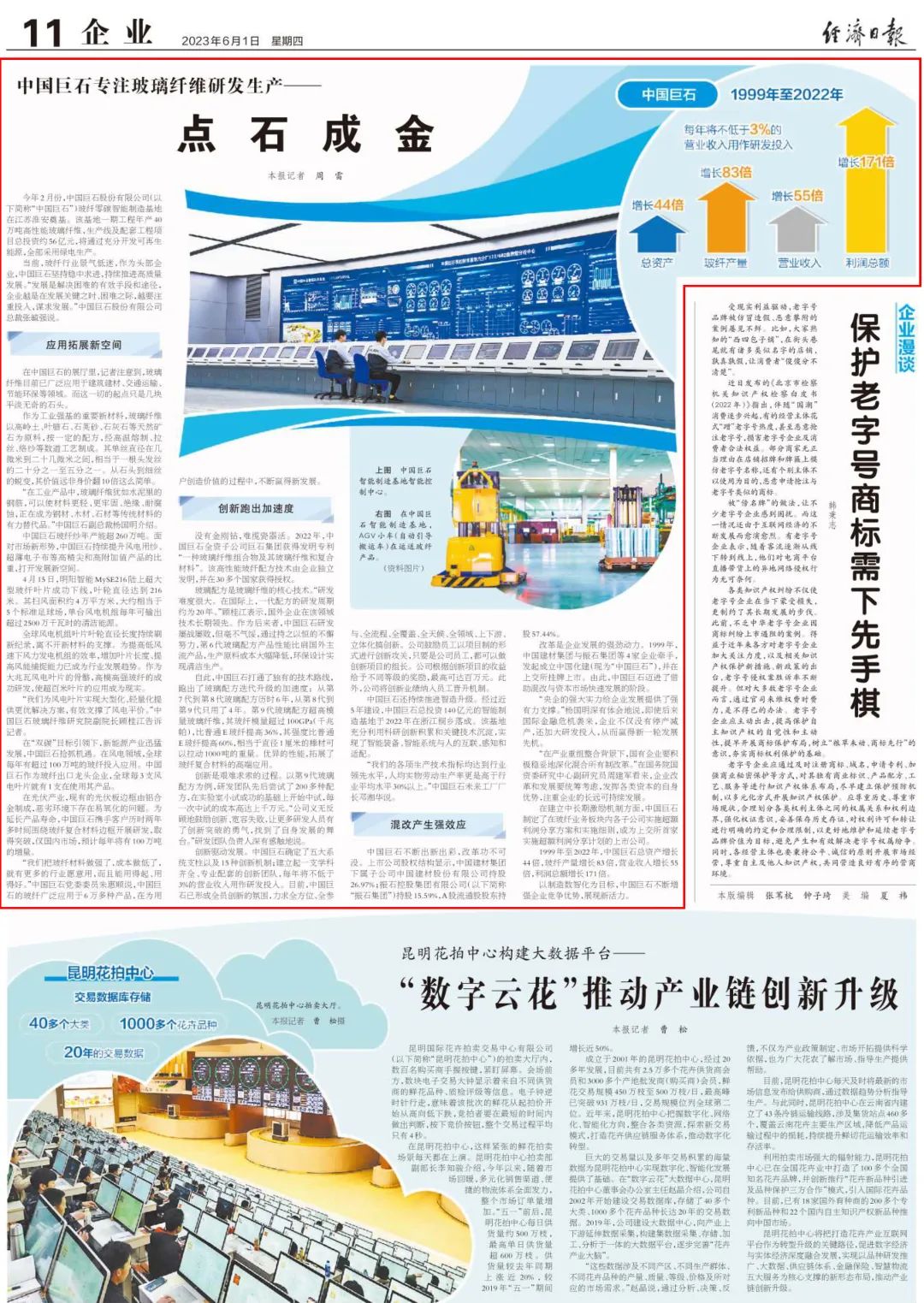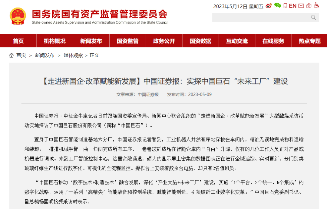 释放刷新活力 引发汹涌动能 ——“走进新国企·刷新赋能新生长”大型融媒采访运动侧记 (扫码阅读原文) 1999年至2022年,,,,,,,,中国巨石的总资产增添了近44倍,,,,,,,,玻纤产量增添了83倍,,,,,,,,营业收入增添了55倍,,,,,,,,利润总额增添了171倍,,,,,,,,合计国有资产保值增值率达217倍。。。。。。国有资源与民营资源的有机融合,,,,,,,,向导中国巨石进入了一个更高更大的平台,,,,,,,,也为其创立了无限可能。。。。。。 经济日报 中国巨石专注玻璃纤维研爆发产——点石成金 (扫码阅读原文) 作为工业强基的主要新质料,,,,,,,,玻璃纤维以高岭土、叶腊石、石英砂、石灰石等自然矿石为质料,,,,,,,,按一定的配方,,,,,,,,经高温熔制、拉丝、络纱等数道工艺制成。。。。。。其单丝直径在几微米到二十几微米之间,,,,,,,,相当于一根头发丝的二十分之一至五分之一。。。。。。从石头到细丝的蜕变,,,,,,,,其价值远非身价翻10倍这么简朴。。。。。。 科技日报 智能制造 助力中国玻纤走向全球 ——中国巨石智能制造基地调研采访见闻 (扫码阅读原文) 报道生动描绘了巨石智能制造基地的生产忙碌图景,,,,,,,,强调中国巨石在j9游国际站官网集团给予的充分信托下,,,,,,,,捉住先机,,,,,,,,牢牢掌握新一轮科技革命和工业厘革的时势,,,,,,,,向数字化、智能化偏向优化升级,,,,,,,,在智能制造方面取得优异效果。。。。。。 中国青年报 国产玻纤“隐形巨头”生长记 (扫码阅读原文) 中国巨石智能制造基地1000多亩的土地上,,,,,,,,一年可以产出 60 万吨粗纱、22 万吨细纱和8亿米电子布,,,,,,,,电子布的长度可绕地球两圈。。。。。。中国巨石还将“未来工厂”建设扩大到了外部,,,,,,,,增进工业上下游协同生长。。。。。。现在,,,,,,,,中国巨石的智能制造等先进玻纤生产手艺已从桐乡总部推广至成都、九江、埃及苏伊士以及美国南卡罗来纳州。。。。。。中国巨石还买通了生产制造与企业谋划的数据链,,,,,,,,通过高标准建设行业工业互联网平台,,,,,,,,实现产品生命周期、生产谋划的全领域的数字化治理。。。。。。 工人日报 这些年,,,,,,,,国企刷新带来新转变 (扫码阅读原文) 从1993年建设,,,,,,,,建起第一座中国人自己设计的玻璃纤维池窑,,,,,,,,到突破外洋恒久手艺垄断,,,,,,,,实现全球市场占有率四分之一,,,,,,,,巨石一起弯道超车,,,,,,,,成为天下规模最大的玻璃纤维制造商。。。。。。怎样创立这份事业?????中国巨石给出了谜底。。。。。。 中国证券报 实探中国巨石“未来工厂”建设 (扫码阅读原文) 中国巨石推动‘数字手艺+制造手艺’融合生长,,,,,,,,深化‘工业大脑+未来工厂’建设,,,,,,,,引领玻纤工业数字化厘革,,,,,,,,现在已实现“热固粗纱、热塑增强、电子基布”三个“全球第一”目的,,,,,,,,为天下玻纤工业生长树立了一座新标杆。。。。。。2023年又开启了打造全球首个玻纤零碳智能制造基地的新征程。。。。。。 “现代新国企”是怎样炼成的 (扫码阅读原文) 在中国巨石未来工厂里,,,,,,,,天天生产的玻纤纱能绕地球450圈,,,,,,,,工厂自动化率超98.5%,,,,,,,,大大提升人均生产效率,,,,,,,,远超行业平均水平。。。。。。 第一财经 混改赋能、重组质变: 三年刷新为国企带来新转变 (扫码阅读原文) j9游国际站官网起劲探索差别化管控新模式,,,,,,,,在允许规模内给予中国巨石最大的谋划自主权,,,,,,,,在“放活”的同时注重“管好”,,,,,,,,确保效率提升,,,,,,,,确保危害可控。。。。。。中国巨石实验探索建设高效的治理架构,,,,,,,,探索实验逾额利润分享等中恒久激励机制……市场化、无邪、信托的“混淆”使得中国巨石活力越来越强。。。。。。 国有资产治理杂志、举世网 “走进新国企·刷新赋能新生长”采访运动走进中国巨石 (扫码阅读原文) (扫码阅读原文) 国有资产治理杂志、举世网刊发《“走进新国企·刷新赋能新生长”采访运动走进中国巨石》。。。。。。1999年至2022年,,,,,,,,混淆所有制刷新助力中国巨石谋划质量和谋划业绩实现跨越式增添,,,,,,,,成为了国家混淆所有制的规范。。。。。。迈入新时代,,,,,,,,巨石产品研发瞄准市场前沿,,,,,,,,一直优化产品结构,,,,,,,,以立异结构高端应用领域;;;;;;;掌握科技革命时势,,,,,,,,全力赋能智能制造,,,,,,,,引领玻纤工业数字化厘革;;;;;;;国际拓展,,,,,,,,打造高质量生长的外洋“增添极”;;;;;;;强化绿色生产历程,,,,,,,,完善绿色设计理念,,,,,,,,实现可一连生长。。。。。。