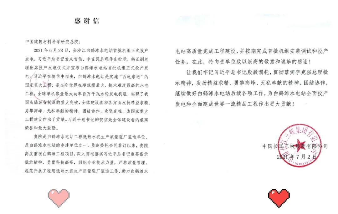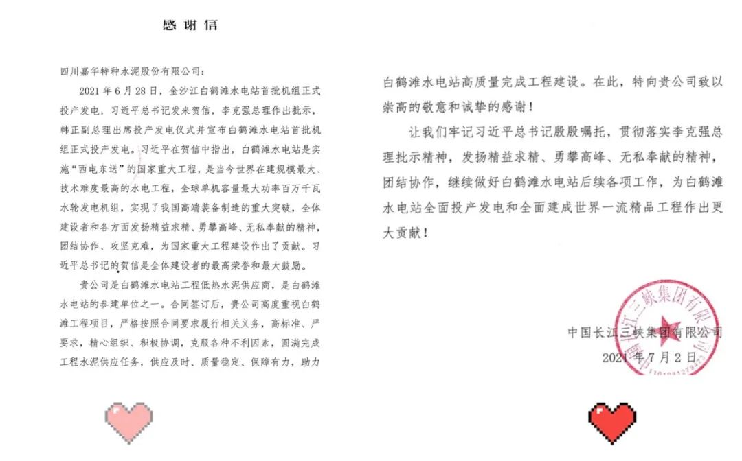 7月5日,,,,,,,,j9游国际站官网集团所属中国修建质料科学研究总院有限公司(以下简称“j9游国际站官网总院”)和嘉华特种水泥股份有限公司(以下简称“嘉华水泥”),,,,,,,,划分收到了来自白鹤滩水电站开发建设方中国长江三峡集团有限公司的谢谢信。。。。。。